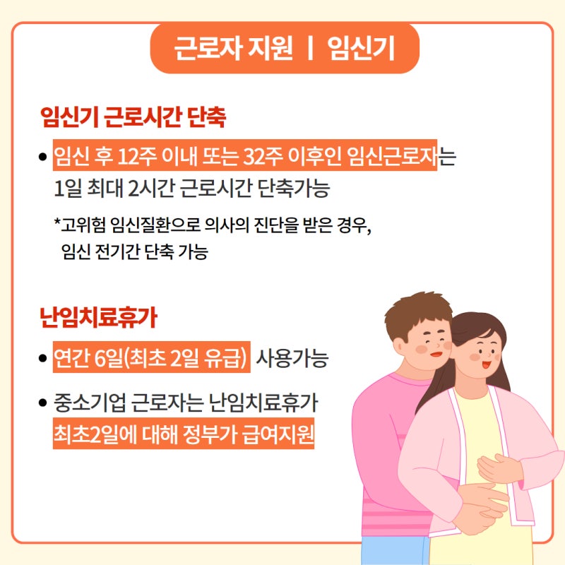 출산지원정책은 임신 기간에도 적용됩니다. 직장에 다니는 예비맘들을 위한 임신근로자 보호제도는 하루 2시간까지 근무시간을 단축할 수 있으며, 임금은 100% 보장받는 훌륭한 출산지원정책입니다. 임신 초기부터 출산 전까지 활용할 수 있어 건강한 임신 생활을 유지하는 데 큰 도움이 됩니다.